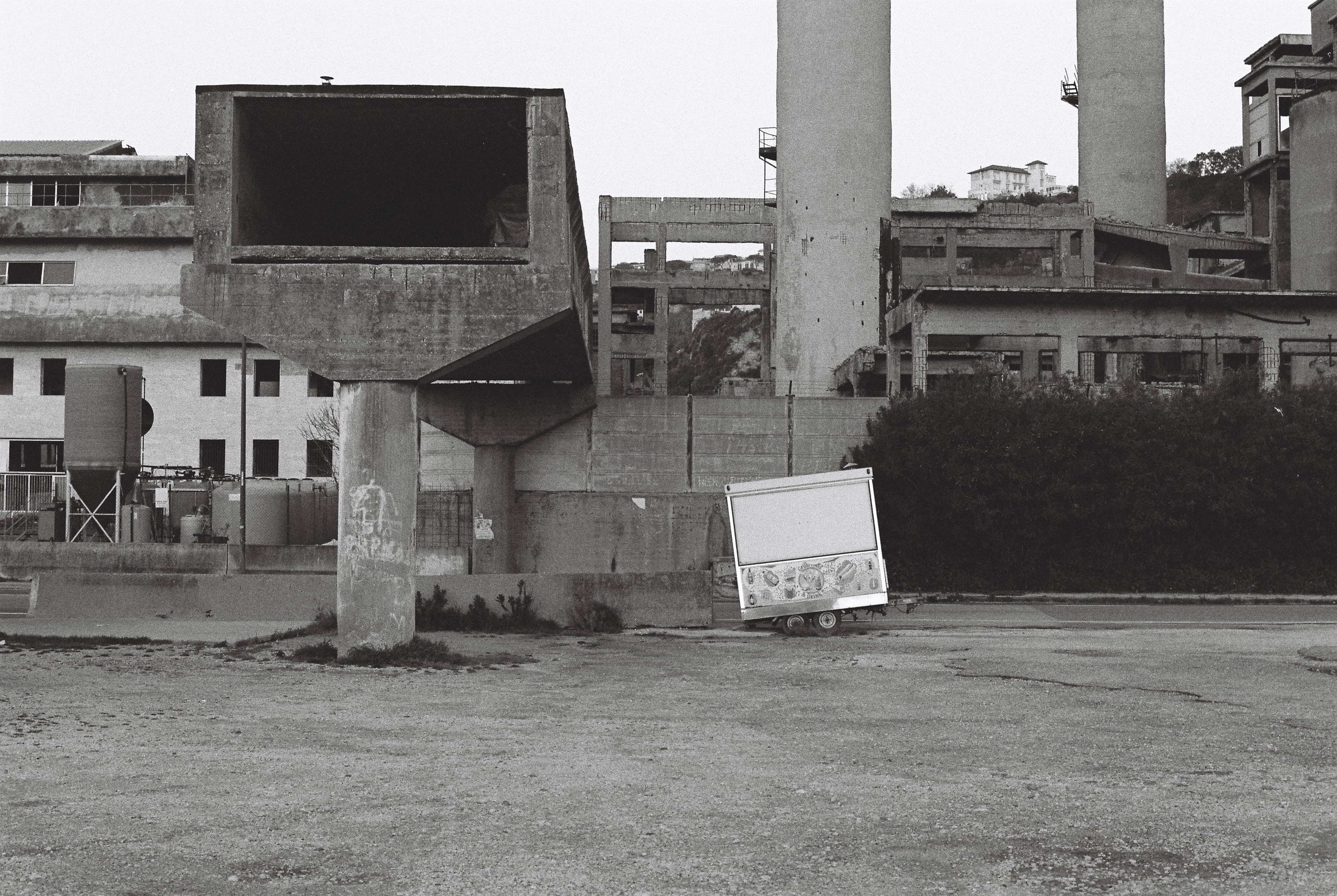 Chimneys, furnaces and warehouses stand still in the empty wasteland.